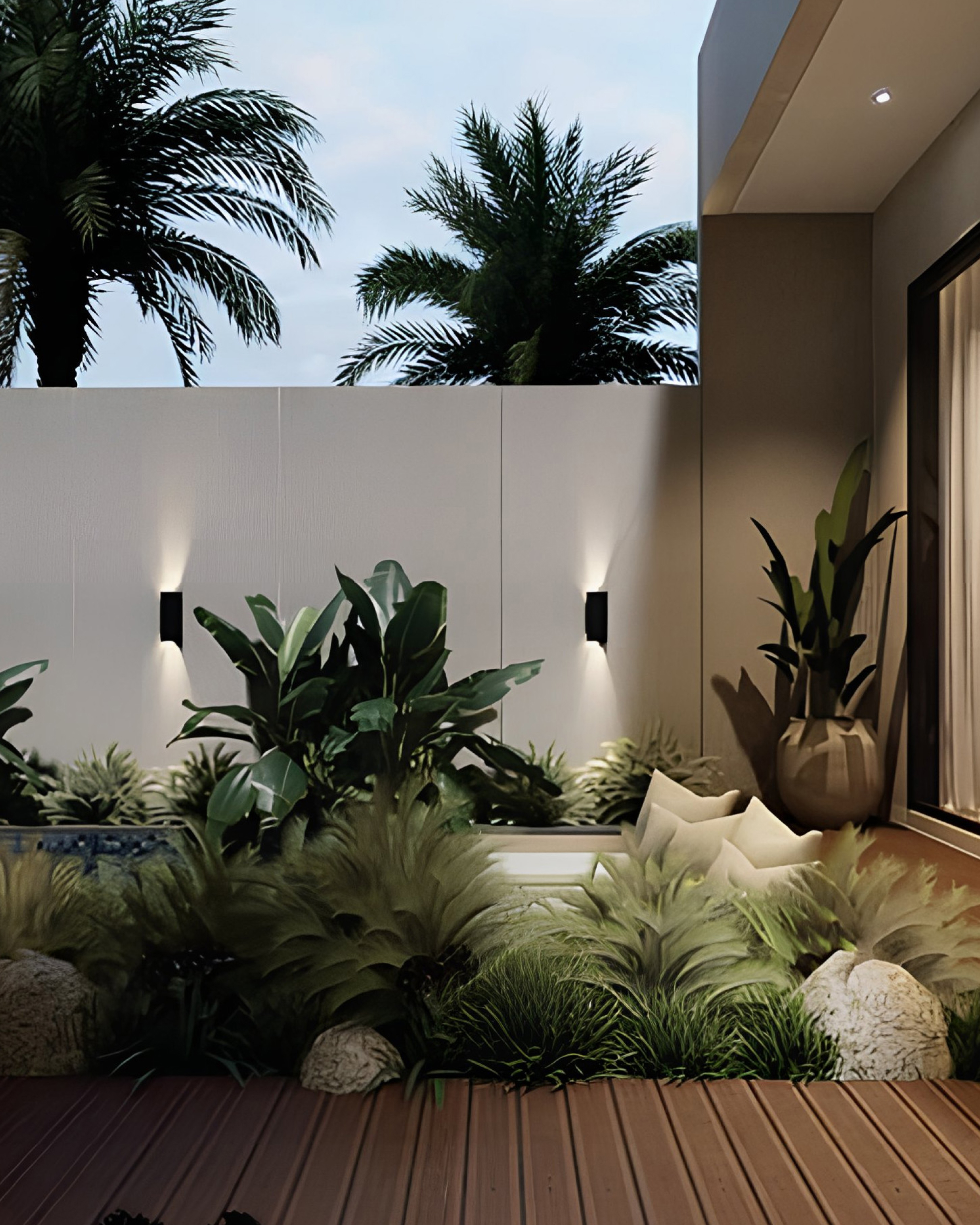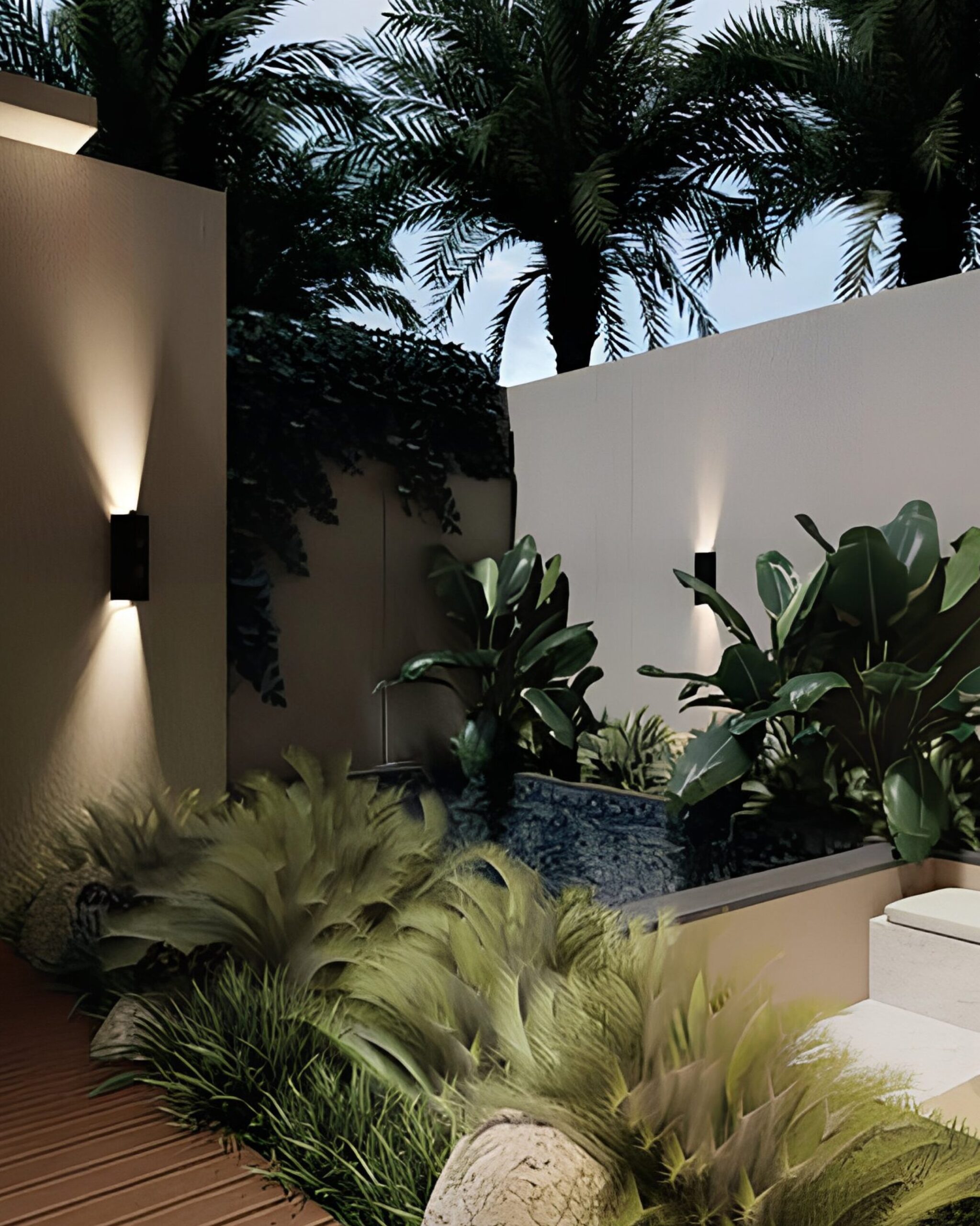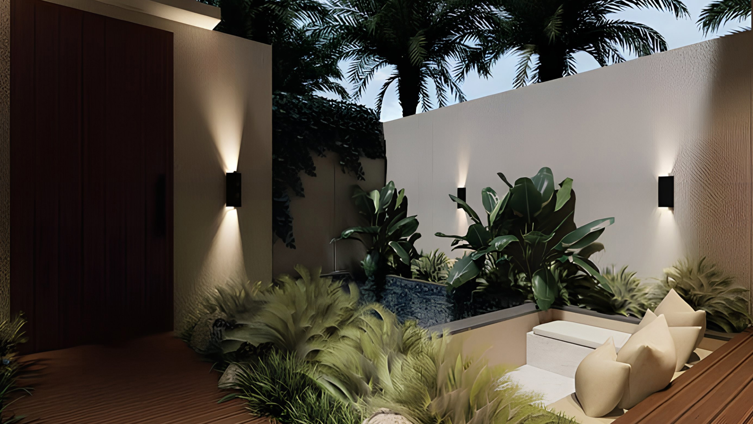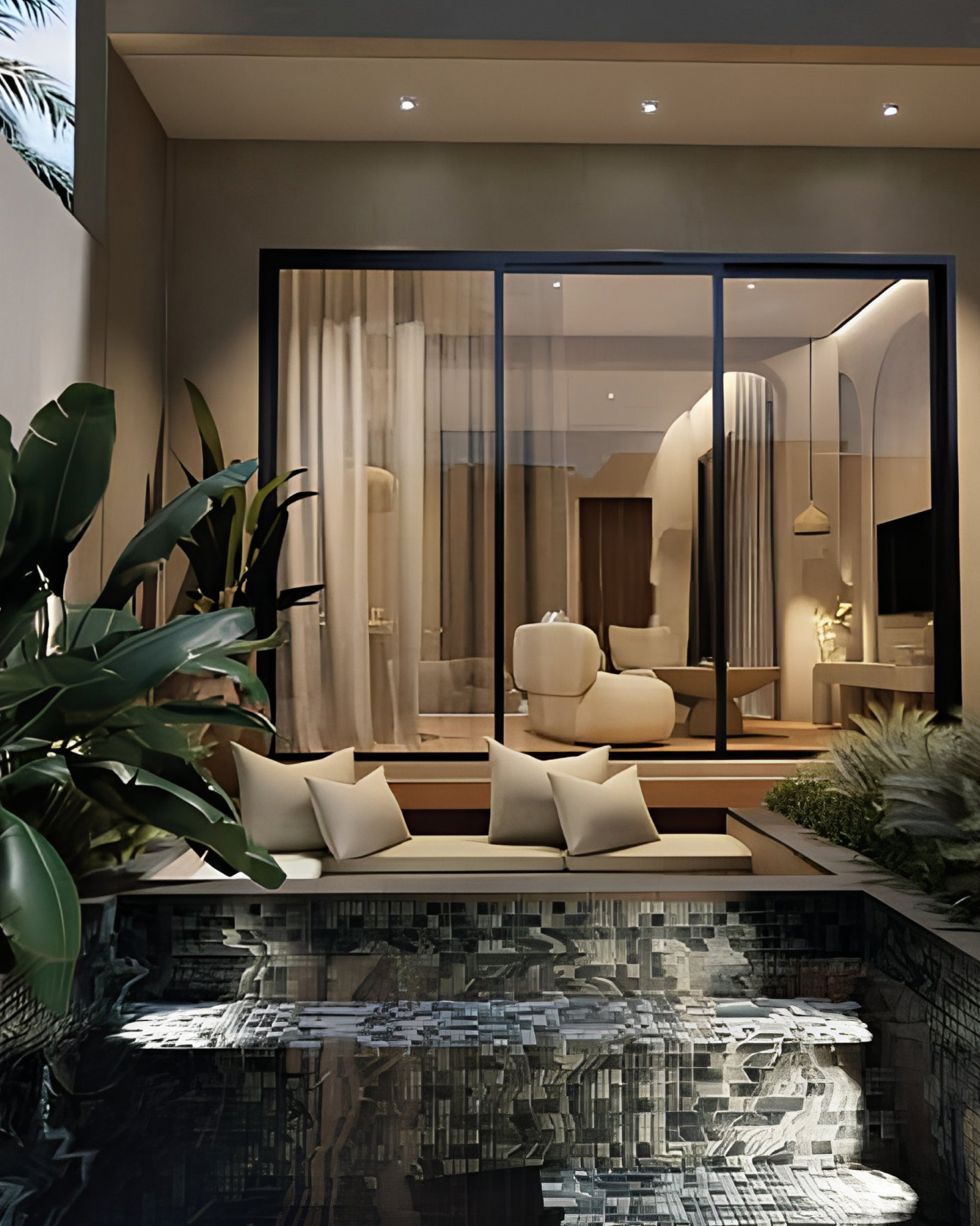 Your private villa unfolds across thoughtfully layered spaces: a sun-drenched pool terrace, a sunken outdoor lounge embraced by tropical foliage, and interiors that balance warmth with quiet luxury.